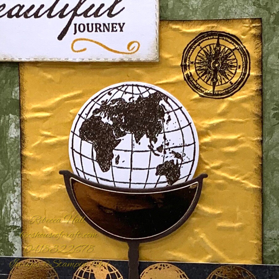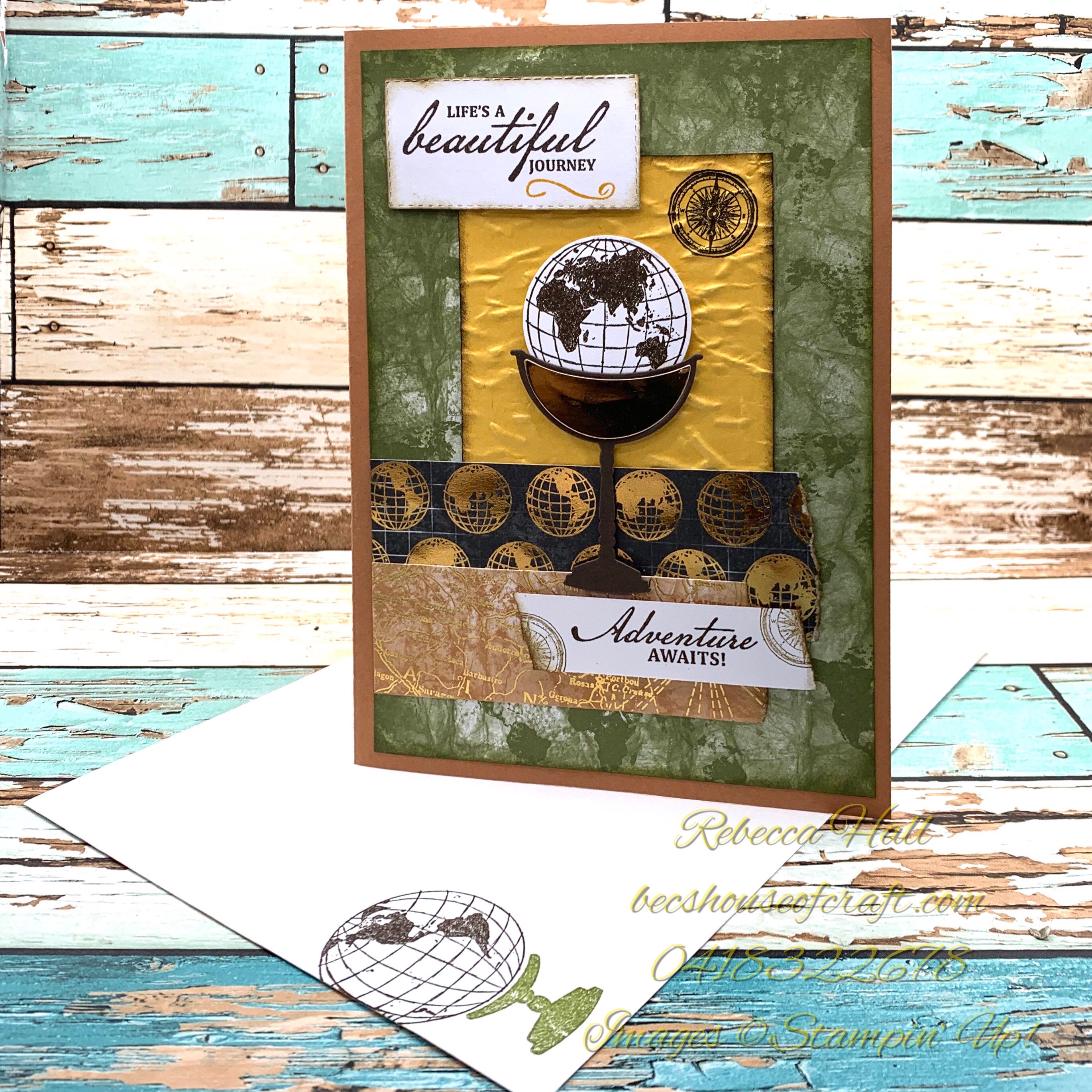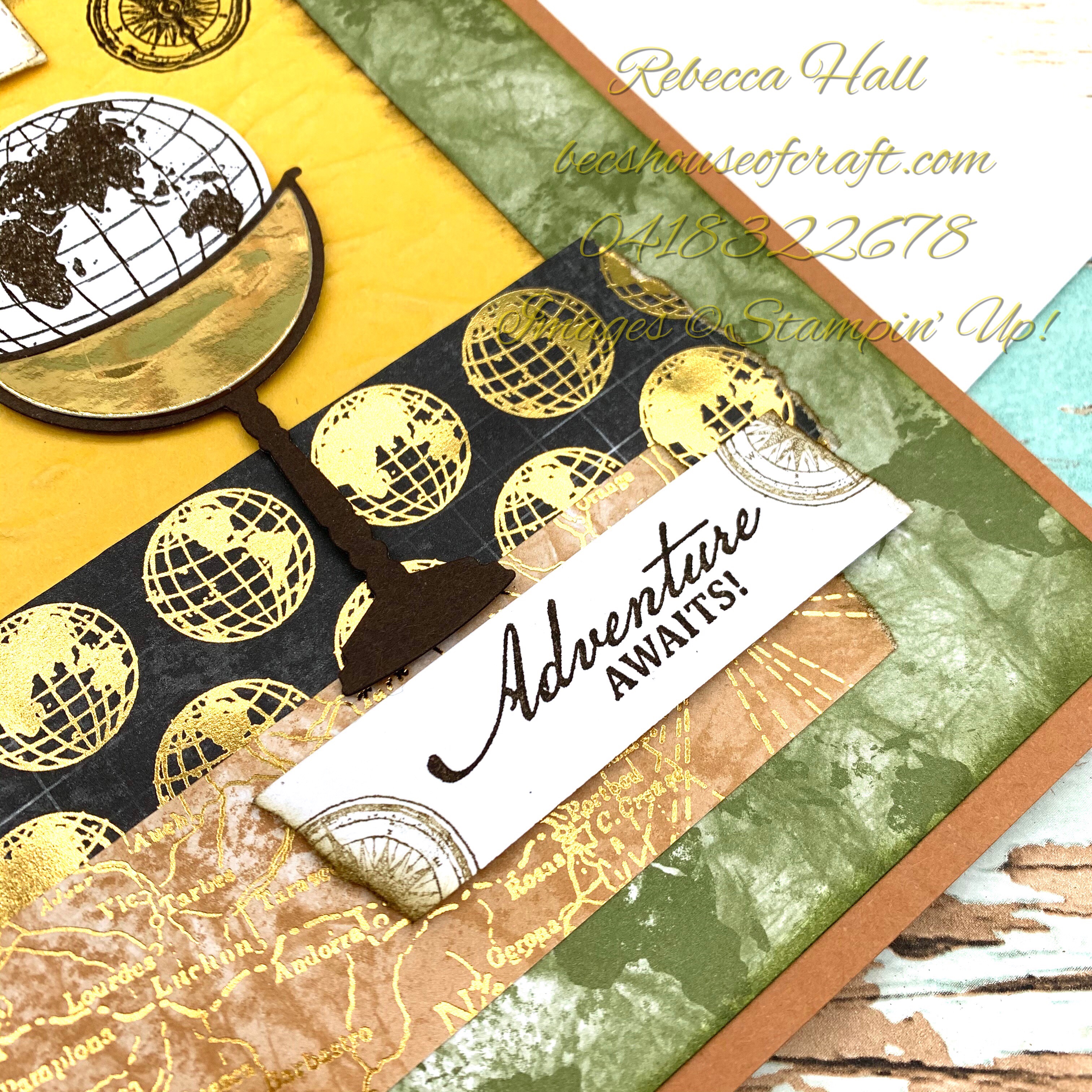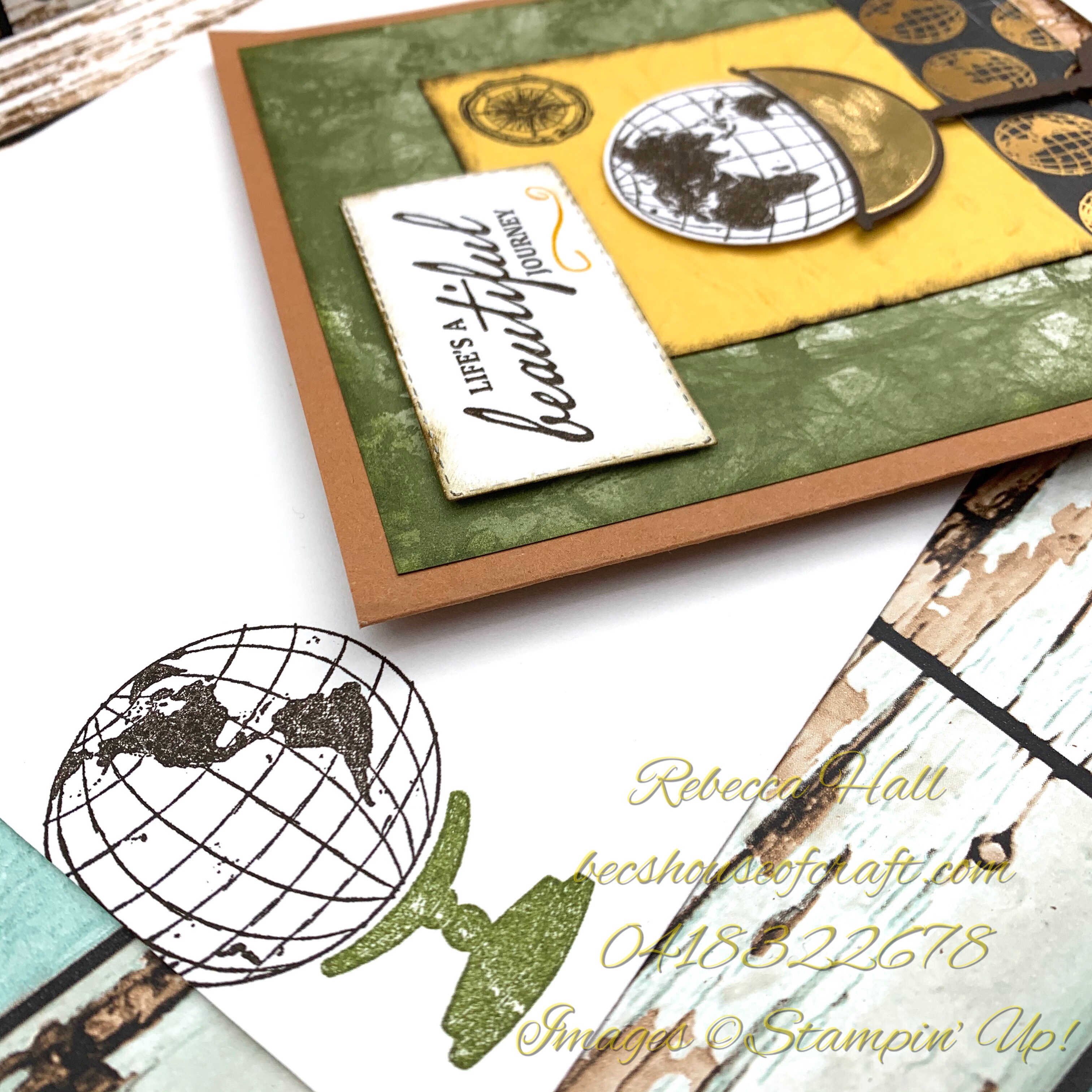 The new upcoming catalogue has the perfect paper, stamp set and dies to use for some one that is set for a wealth of worldwide travel and adventure. It is available in a suite called World Of Good. The paper in this suite is called World Of Good Speciality designer series paper. It has travel patterns and world maps on it with brass accents.