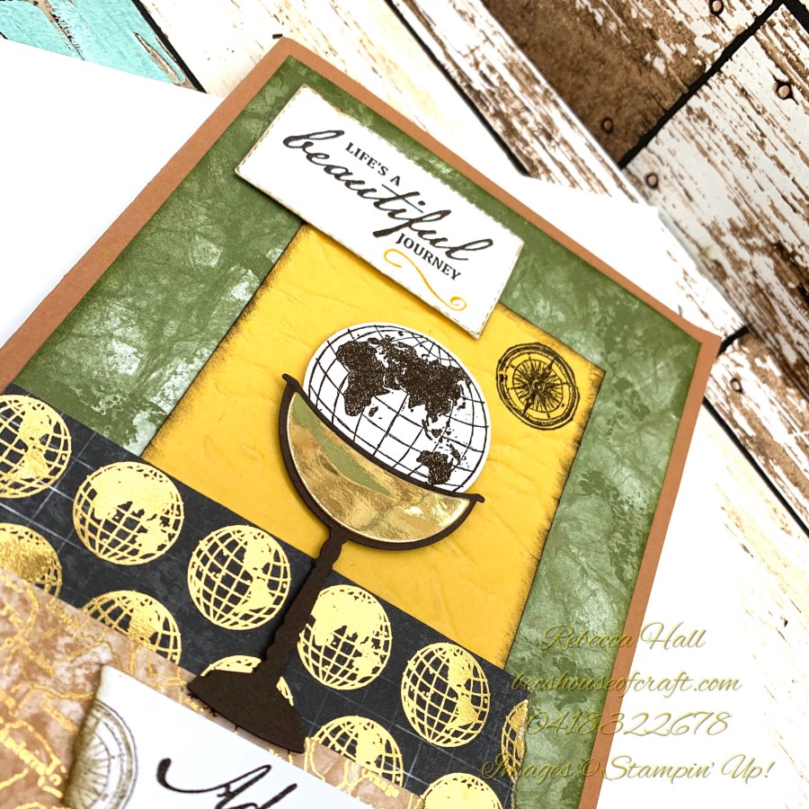 The new upcoming catalogue has the perfect paper, stamp set and dies to use for some one that is set for a wealth of worldwide travel and adventure. It is available in a suite called World Of Good. The paper in this suite is called World Of Good Speciality designer series paper. It has travel patterns and world maps on it with brass accents.