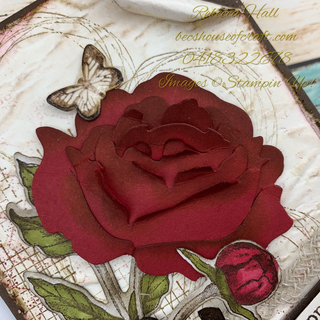 I simply can not stop working with this lovely Prized Peony stamp and die set. I also love vintage looking cards. So to create this card I reverted back to using my favourite colours together Cherry Cobbler, Early Espresso, Soft Suede and Very Vanilla. These colours without fail always give you a vintage look to your card making.