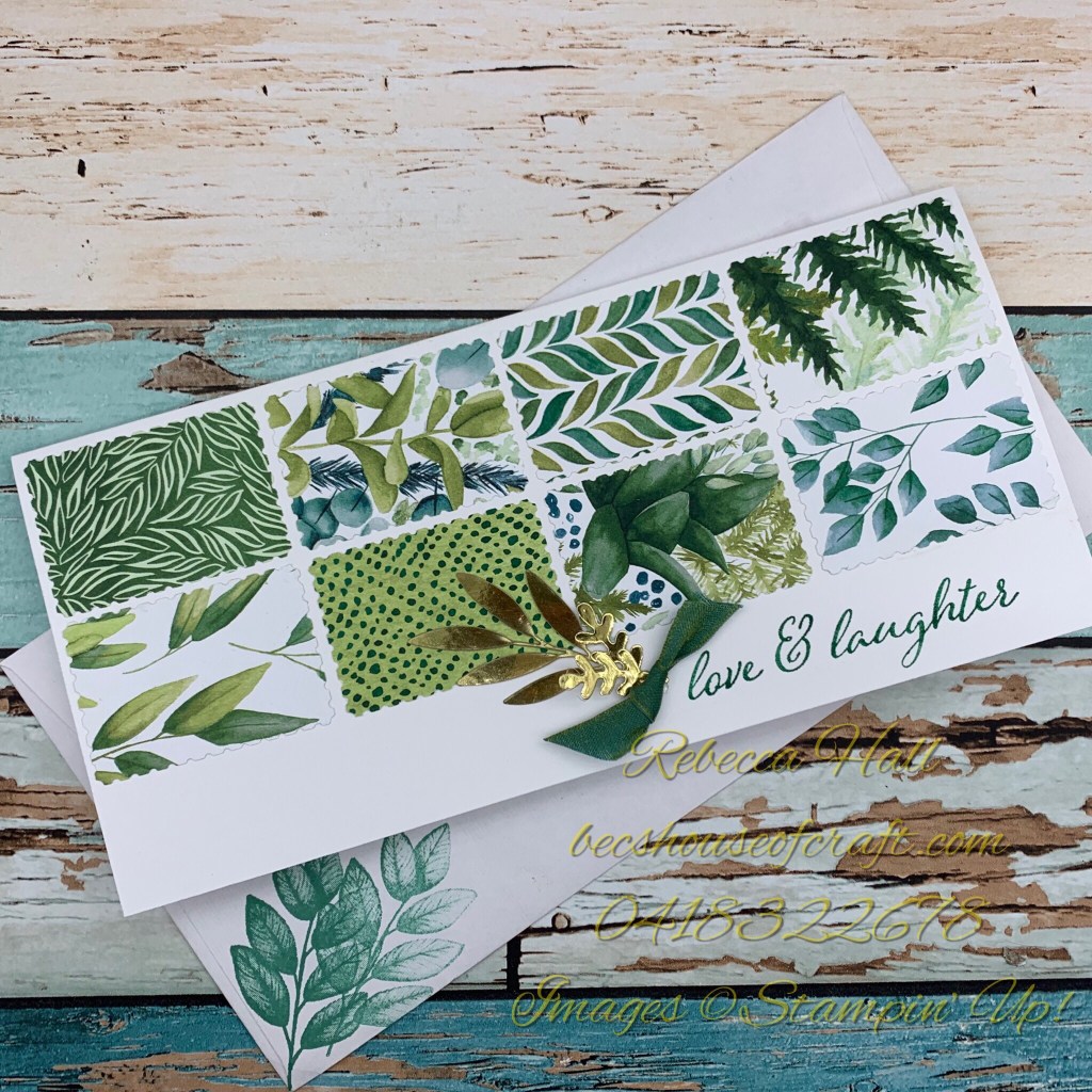 This card is a long slim DL sized card which is 210mm x 99mm or 1/3 of an A4 sheet. I have punched out eight rectangle postage stamps using the Forever Greenery designer series paper and adhered them with to the front of my card base with some Tombow, making sure that the gap at the top and the side is the same to start with and then following this pattern along until the front of the card base is completed.