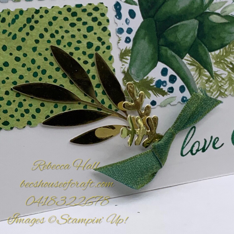 To finish the card off I added some gold foil foliage embellishments from the Forever gold laser cut specialty paper and some extra die cut pieces I cut from the left overs of the gold laser cut paper with a glue dot. I then tied a knot in some old olive/pretty peacock reversible ribbon and adhered that over the bottom of the gold foliage with another glue dot.