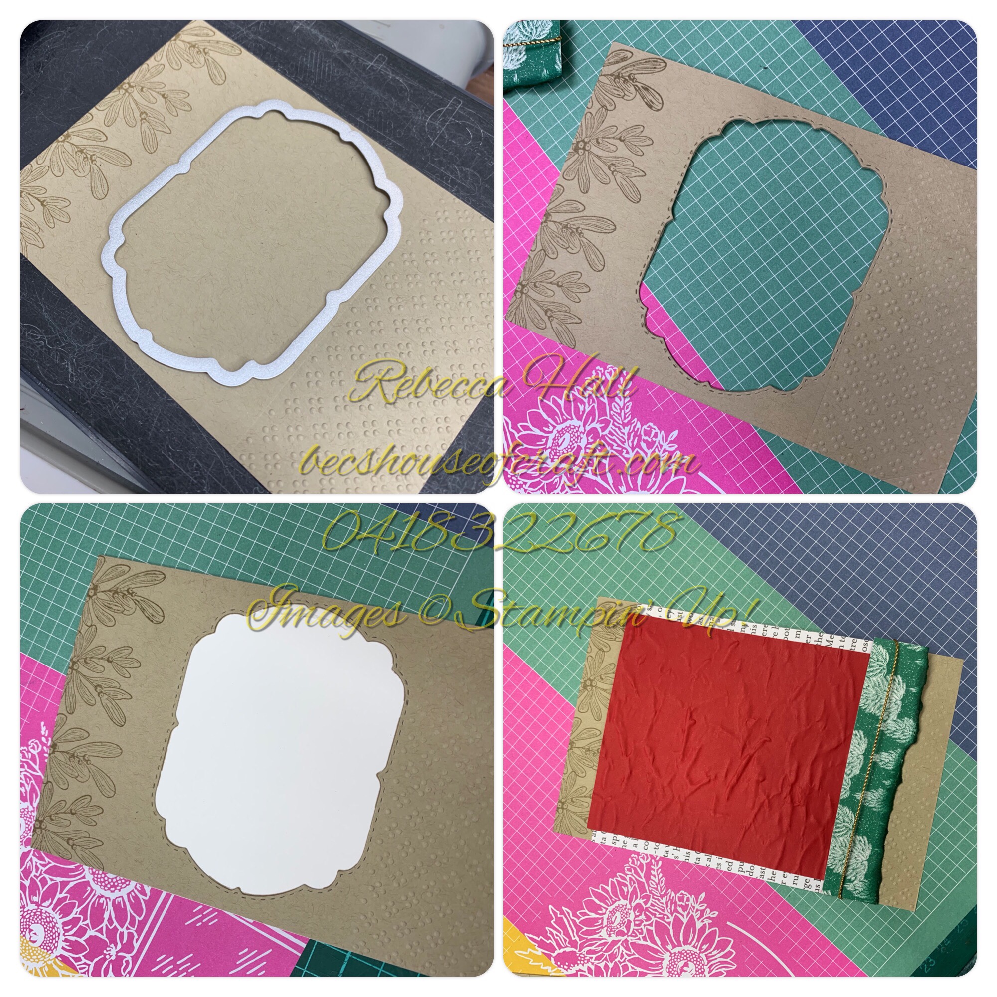 To save card stock I used a die from the Celebration Labels Dies and cut out the middle of the card bases. I can do this because when the card is made you won’t see the bit underneath after I put the top Real Red piece of card stock over the top. I also did this with the Wonder of the Season specialty designer series paper that is under the Real red card stock. Doing this gives me a piece of card Crumb Cake card stock and Designer series paper already cut for another project in the future.