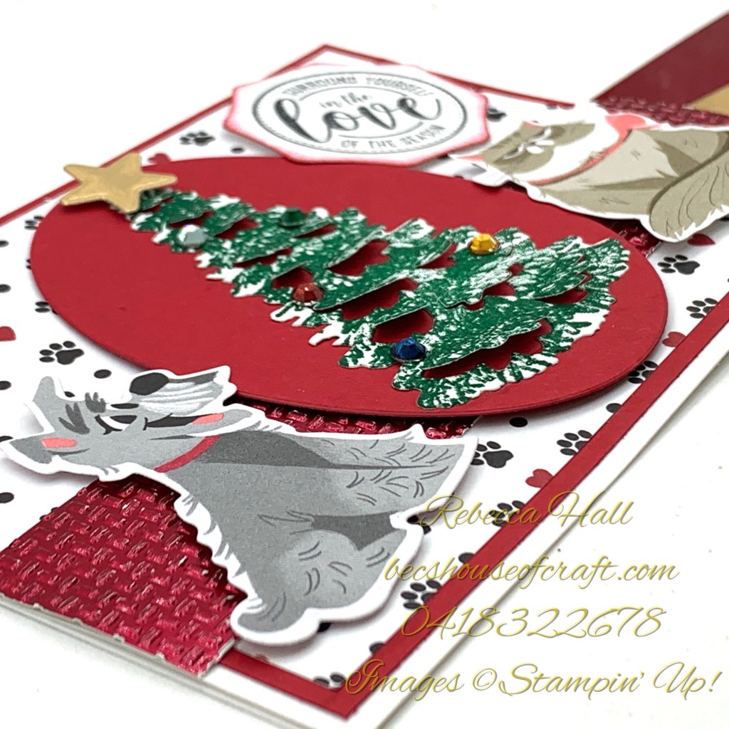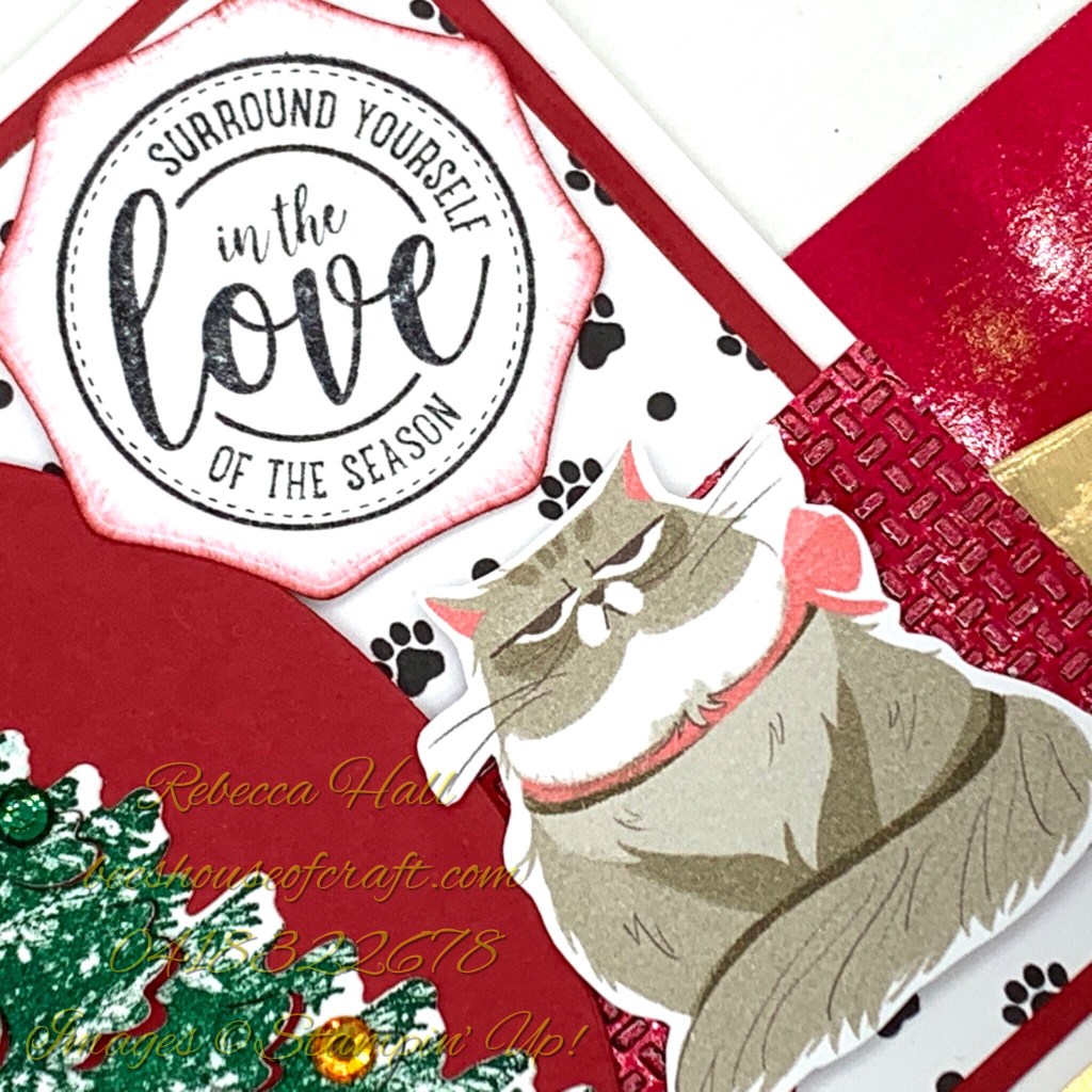 I just love the cats face on this card, he looks so grumpy so I couldn’t help but use the sentiment from the Wrapped In Christmas stamp set. I could just imagine my Merlin sitting under the tree looking like this on Christmas morning while Loki the French bulldog runs around all excited.