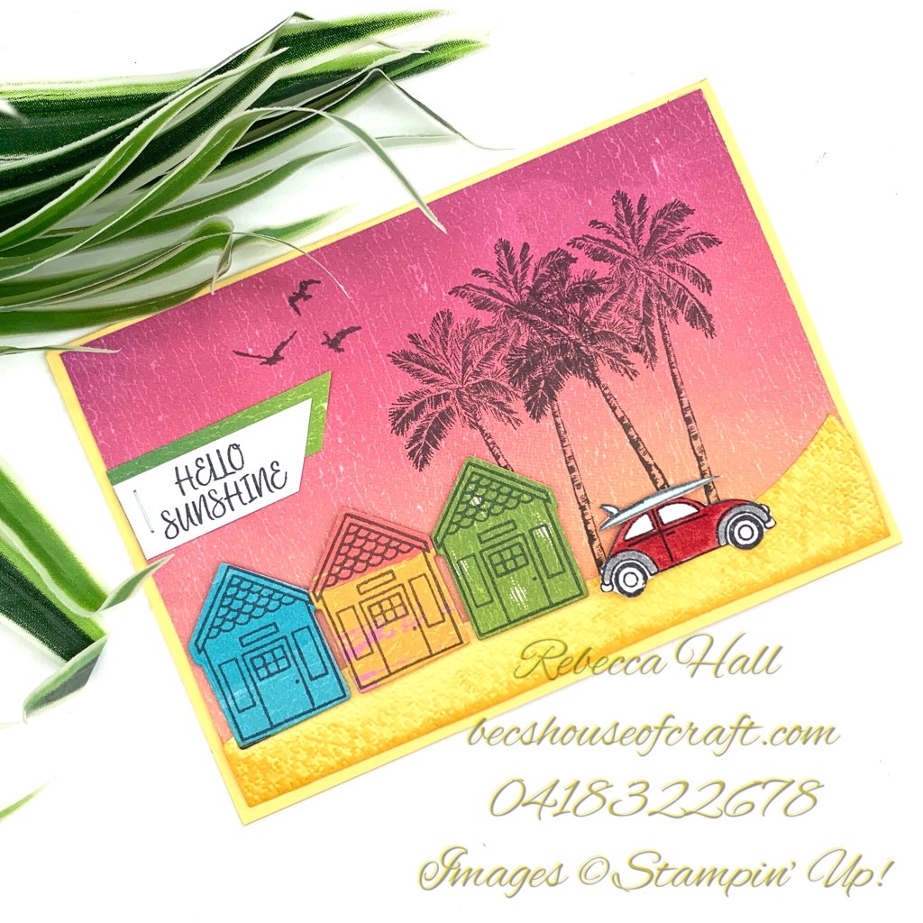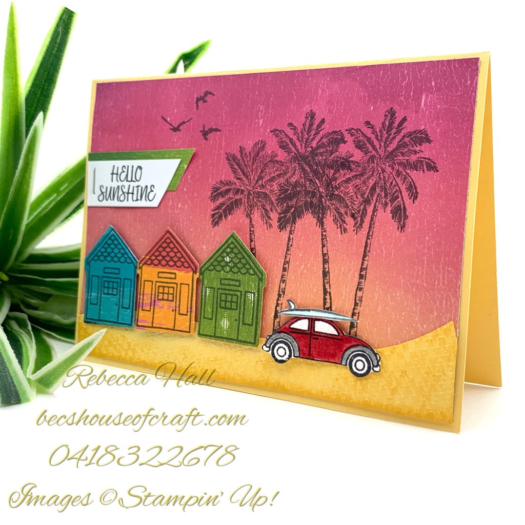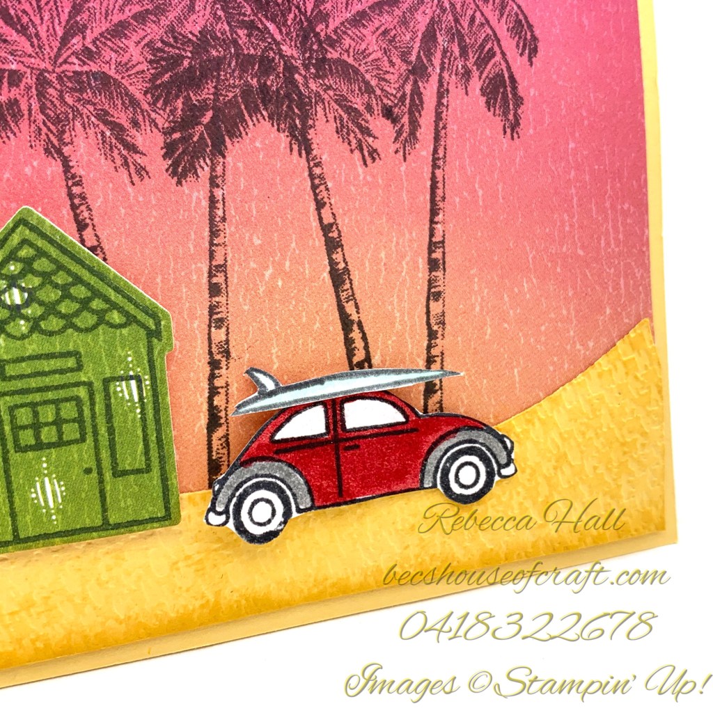 The cute little Beetle car is from the Coming Home stamp set but I hand drew the surf board on top. The palm trees are from the Timeless Tropical stamp set stamped in Memento black ink.