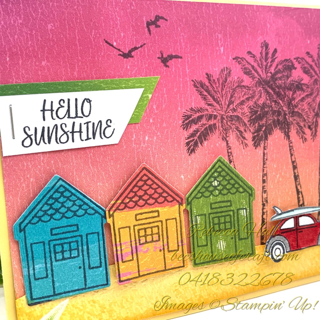 Using the Artistry Blooms paper in the background I instantly saw sunset and imagined being down on the beach here on the Mornington Peninsula where we live and seeing the colourful beach Bathing Boxes lining the sand. To create the Bathing Boxes I used the Coming Home stamp set and matching dies and stamped them directly onto the Artistry Blooms paper in all different brightly coloured Designer Series Paper.