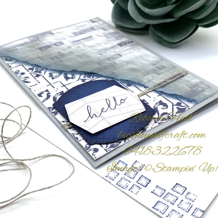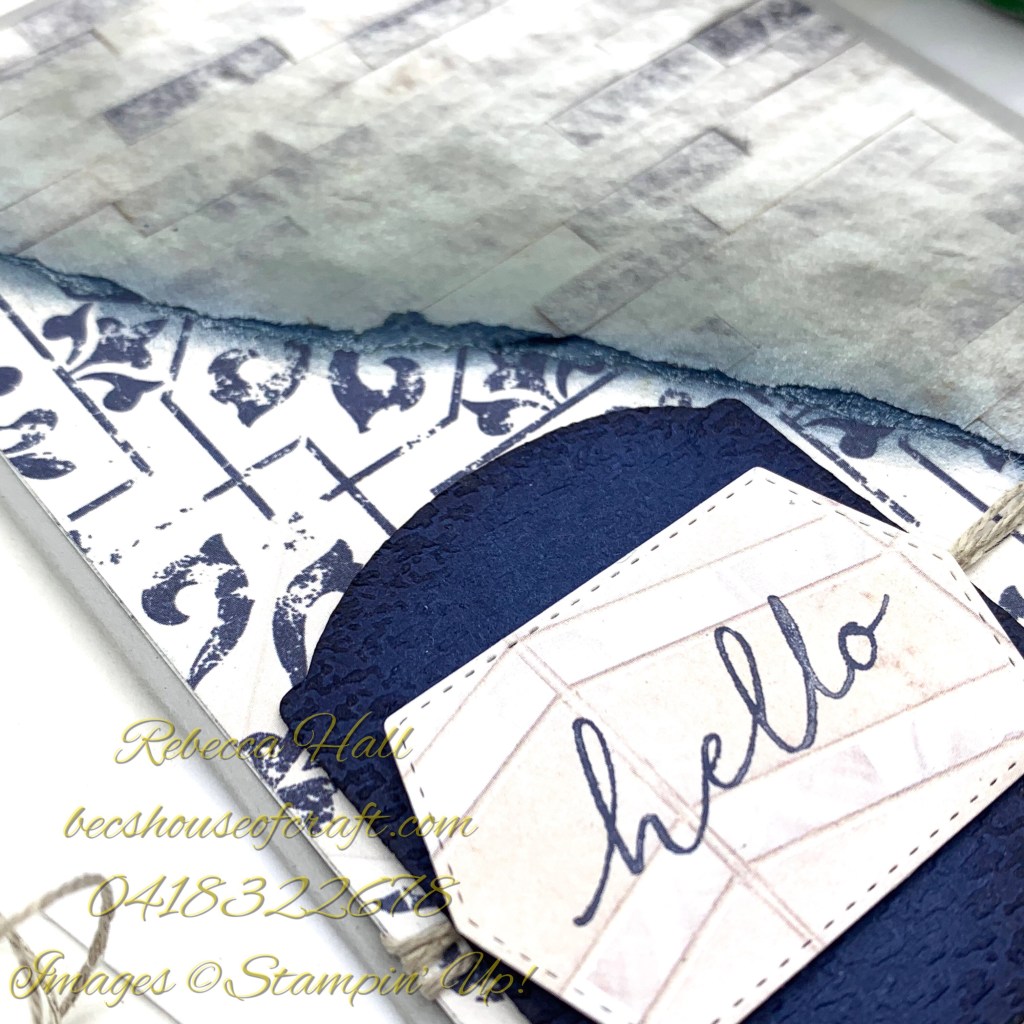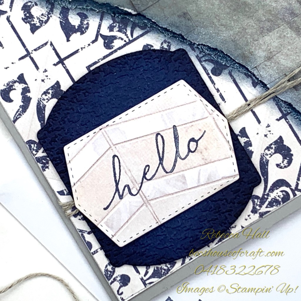 I then wrapped some Linen Thread around the two layers at the bottom of the card front base and attached this to the card base. Using the Tasteful Labels Dies I cut the Night Of Navy card stock label and ran it through the Tasteful Textiles 3D embossing folder. I then cut some more In Good Taste Designer Series Paper with the Tasteful Labels Dies and stamped the Hello stamp from the Tasteful Touches stamp set in Night of Navy ink and adhered that to the card front.