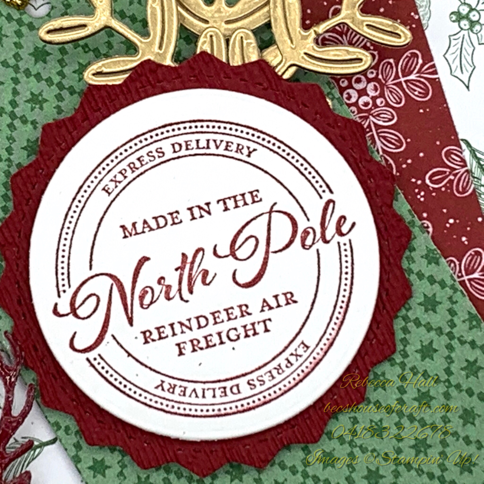 The reindeer is cut from the North Pole Wonder dies. To make it appear like an shiny embellishment I simply covered the Cherry Cobbler card stock with thick clear packing tape that you would by from the hardware or stationary department. Then I ran it through the die cutting machine and volia a nice shiny embellishment all cut ready to go.