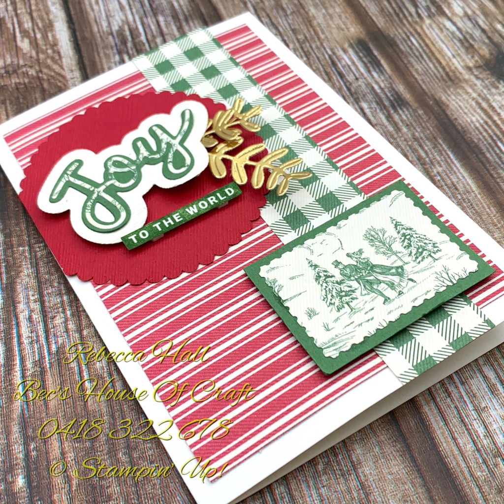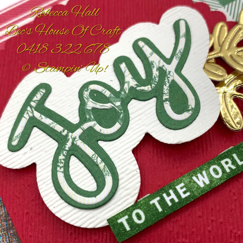 To create the sentiment I used the Peace & Joy stamp and die bundle and cut the thin word Joy out of the Toile Tidings Designer Series Paper to create that variegated look. Stamping the “ to the world” from the Peace & Joy Stamp Set in Garden Green ink and trimming around the edge using my Paper Snips.