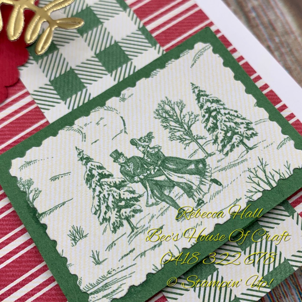 To show of the paper more I punched the Toile Tidings Designer Series Paper with the Rectangle Postage Stamp Punch and mounted this on a piece of Garden Green Card Stock and attached it to the card front using Stampin’ Dimensionals.