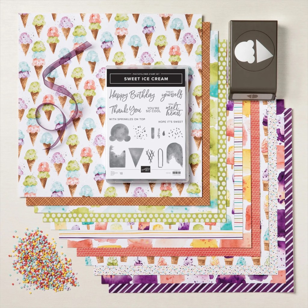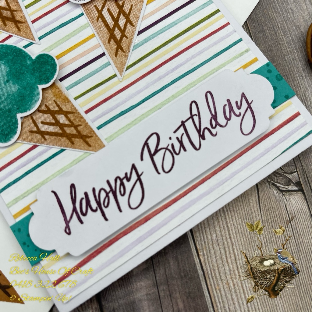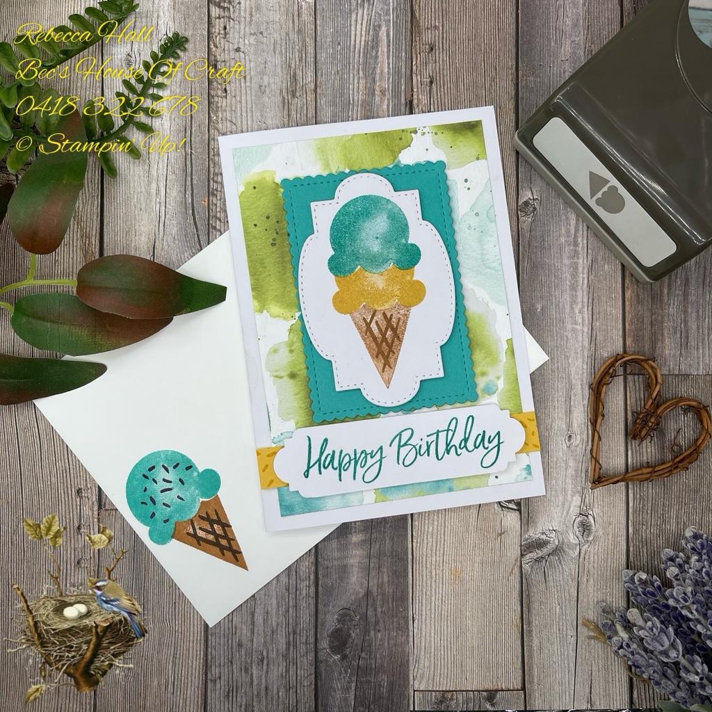 The second card I made was very similar to the first one however I used my favourite dies out of the annual catalogue called Stitched So Sweetly Dies to create the shape that I stamped the icecream on. The stamping was done using a masking technique. This is where I punched out the ice cream shape out of thin copy paper and placed this over the stamped image and then stamped again over the edge of the first image which is masked.