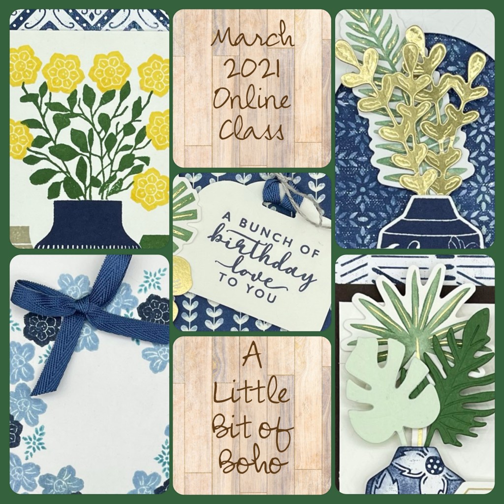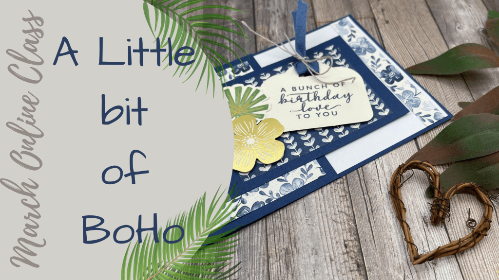 For this months class we will be working with the Boho Indigo product medley. this collection of products has beautiful Designer Series Paper, embellishments, and die cut pieces. This class will include many elements which you will be receiving in your kit.