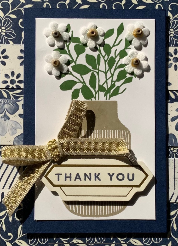 To finish the card off I stamped the thank you sentiment onto one of the die cuts in Night of Navy ink and attched this using Stampin’ Dimensionals. Using the very vanilla and gold pleated ribbon that comes in the medley I made a bow. This was then attached to the card front using a glue dot.