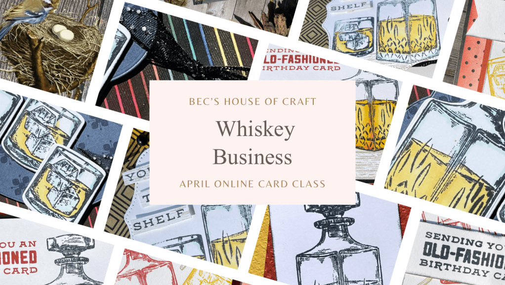 For this months class we will be working with the Whiskey Business Stamp set. This Stamp set is the ideal male stamp set that includes a whiskey tumbler, whiskey bottle and some great sentiments for the perfect male card. This class will include many elements from Designer Series Paper, ribbon and embellishments, all of which you will receive in your kit.
