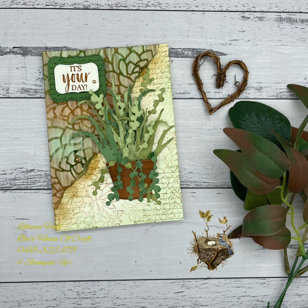 As an added bonus I made another card but a more masculine card. Using the mask from the largest die, some Embossing Paste and a palette knife I smeared the embossing paste over the mask and it became a raised image that I then coloured in using my Stamping Blends. Tearing it in half and attaching it to my card base which I had previously stamped the largest stamp from the Simply Succulents stamp set in Cinnamon Cider ink and the stamp with the words on it is from the stamp set Very Versailles stamp set stamping in Garden Green ink. The plants and the pot are cut from the dies from the Potted Succulents Dies and arranged using Stampin Dimensionals.