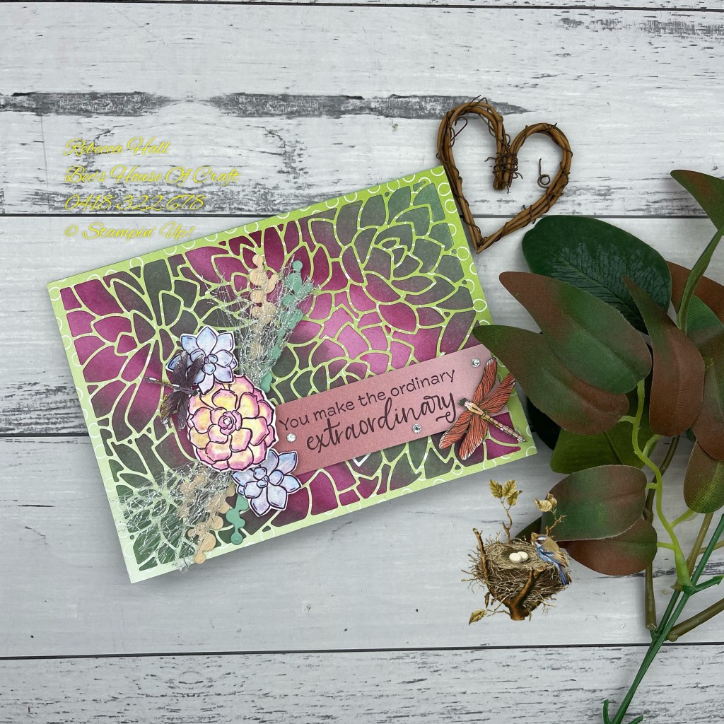 In this card pictured below I created the background, with the new Blending Brushes and randomly using circular motions I applied some Mint Macaron and Rich Razzelberry ink for the background. Then using the largest die from the Potted Succulents Dies from the January to June mini catalogue I ran my Designer series Paper through the Stampin Cut and Emboss machine. I then stamped the three flowers and coloured them in using my stamping blends. Attaching these over the left hand side of the sentiment which is stamped on some left over Oh So Ombre designer series paper from Sale-A-Bration in Blackberry Bliss ink. With the Natural Touch Specialty paper and some Mint Macaron card stock I die cut the String of Pearls die and attached these under my flowers using some Stampin Dimensionals. The silver bits of ribbon are from the metallic Mesh Ribbon that carried over from the Holiday mini catalogue. To see more on these products head on over to my online store here. Bec’s House Of Craft Online Store