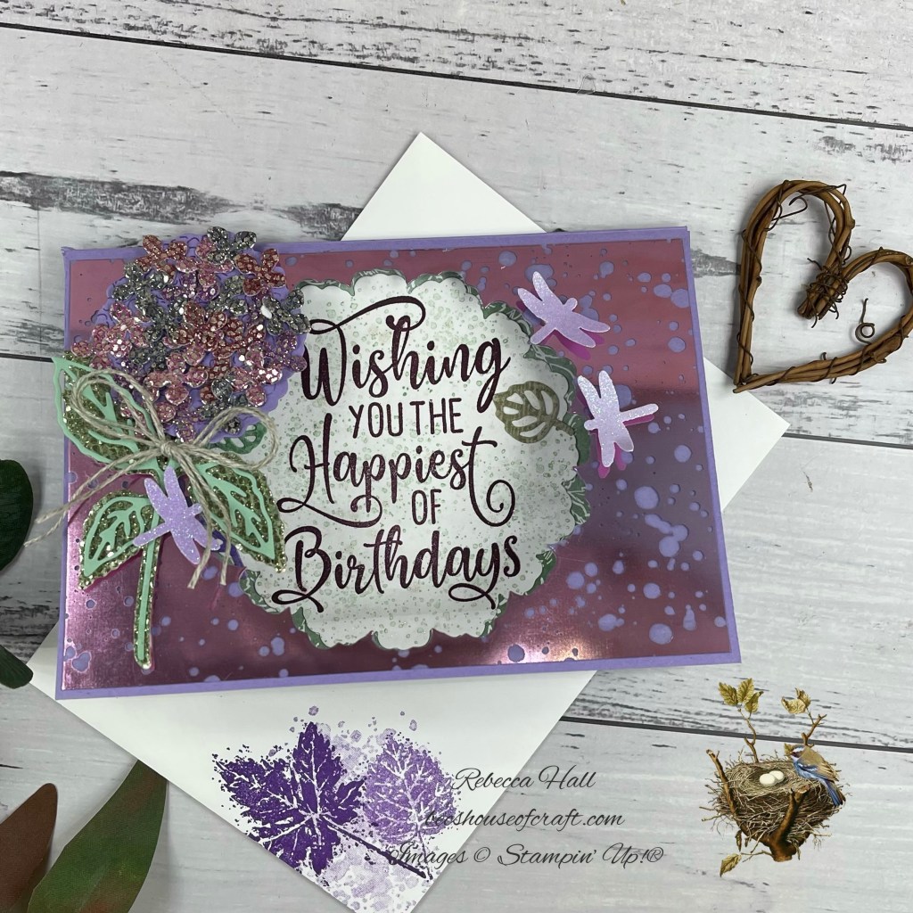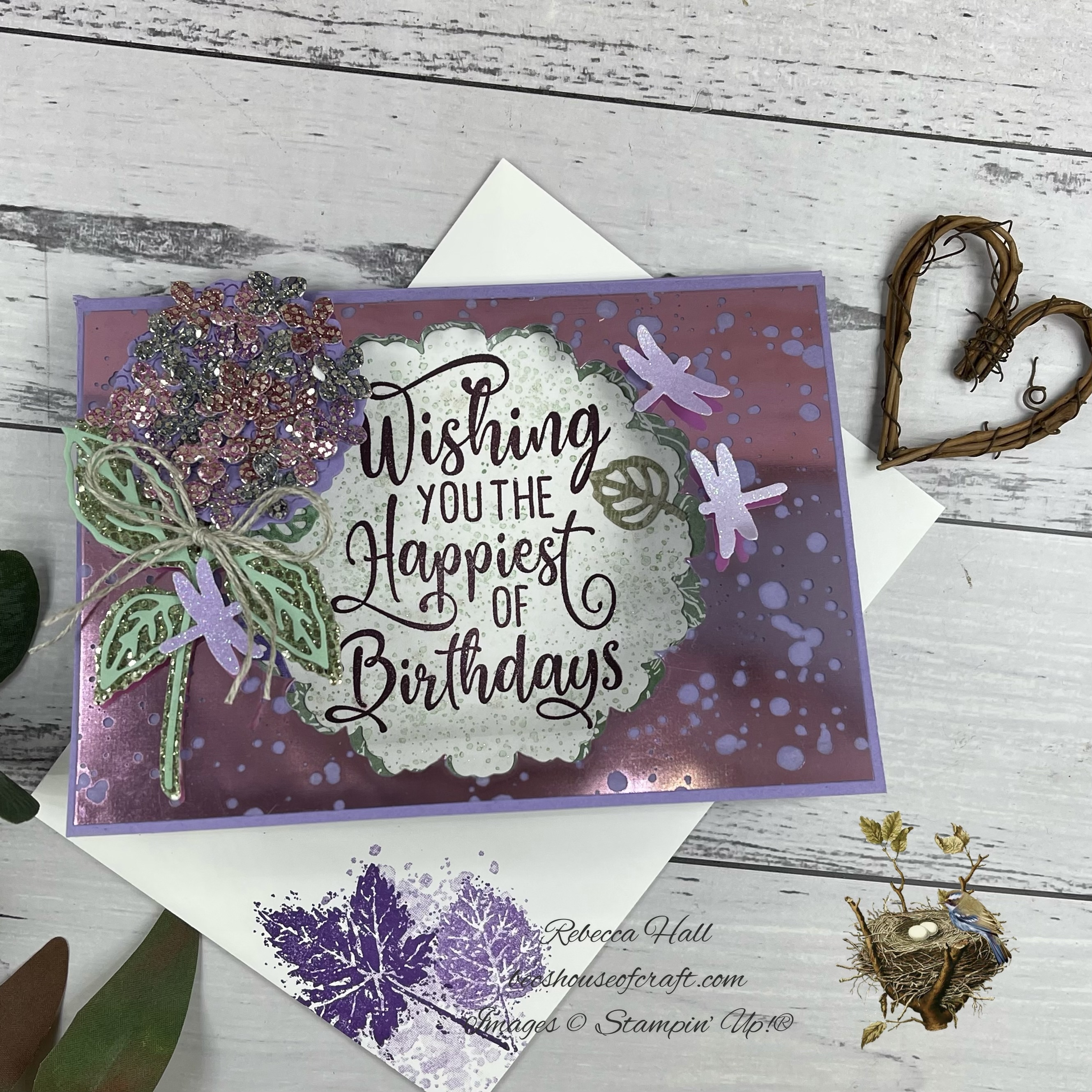 I used the Hydrangea Hill Mercury Glass Designer Acetate and the Hydrangea Haven bundle for the front of the card with a cut out from the Encircled In Beauty dies and the dragon flies are punched out using the Ombre Specialty Paper. I coloured some of the Be Dazzeling product that was free with a spend of $90.00 during our sale -a-bration over the last two months to create the petals on the flowers and leaf backgrounds. It makes me sad that Sale-A-Bration has finished for the year.
