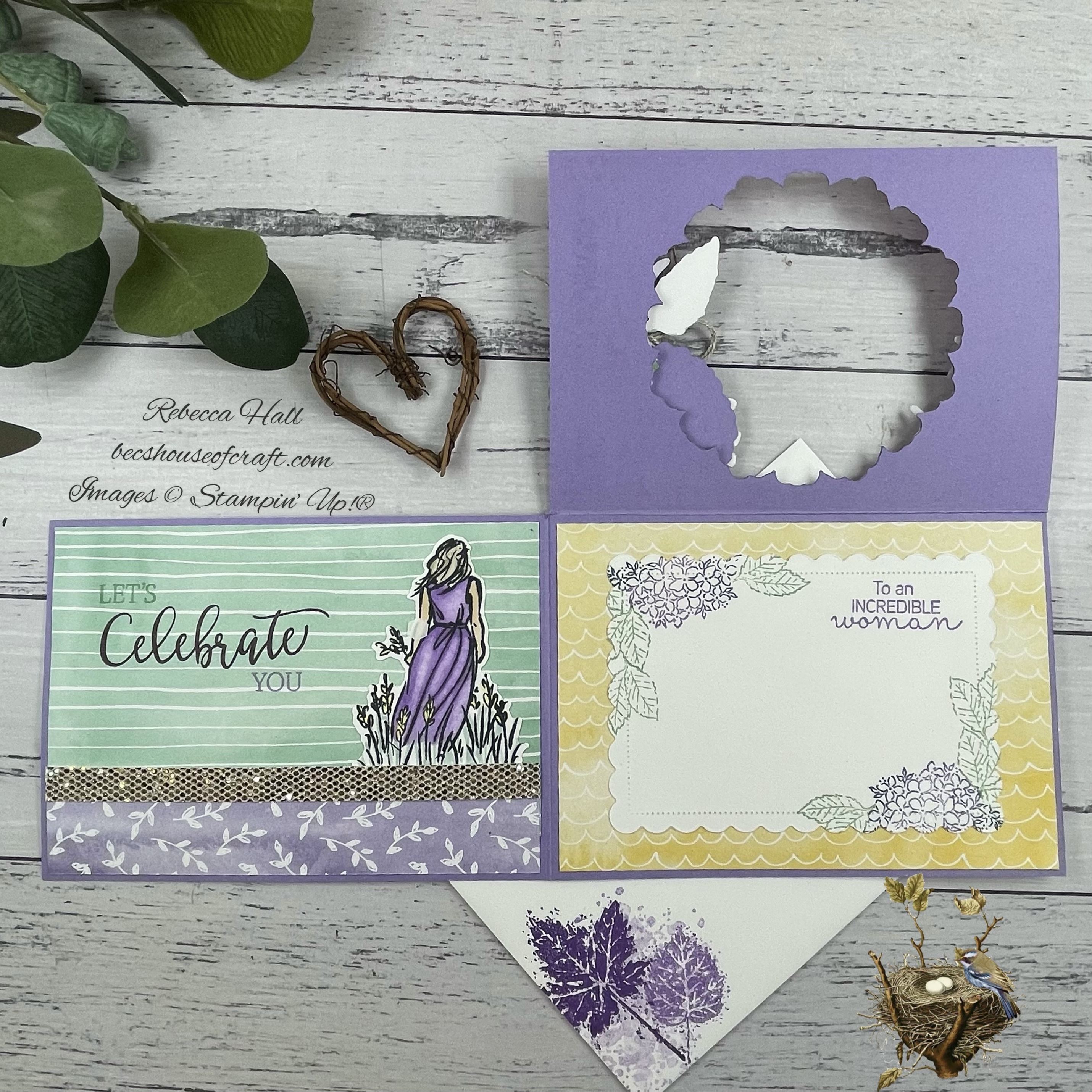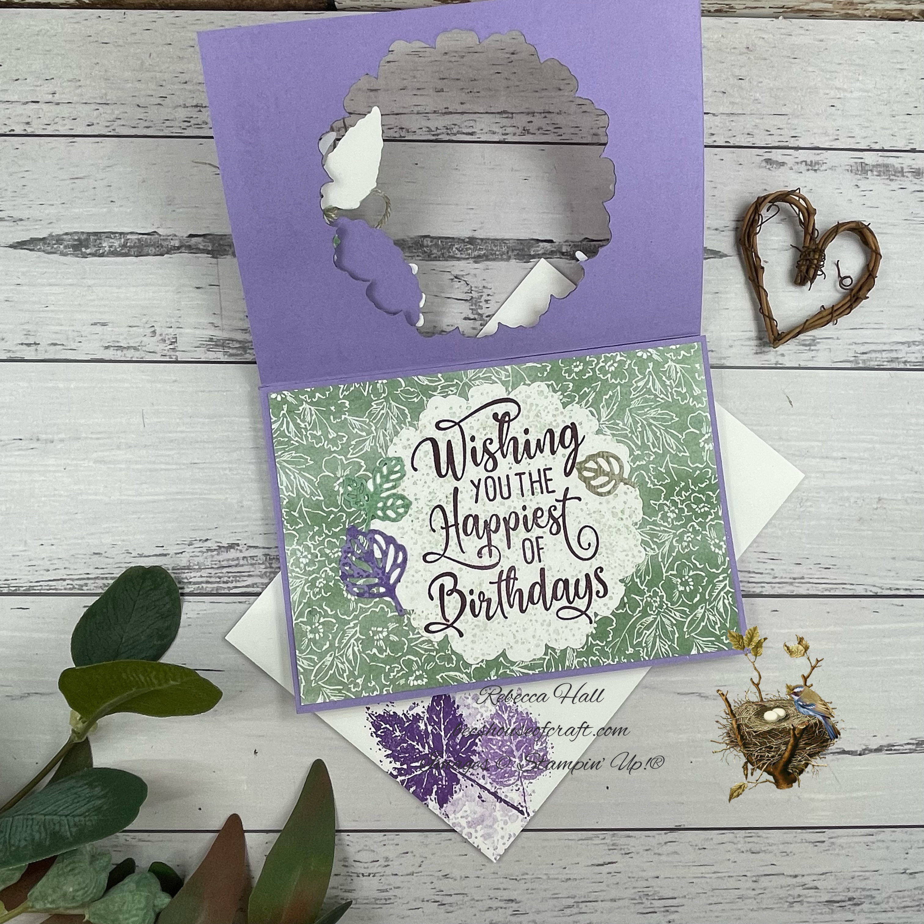 When you open the first layer of the card up I have used the Hand Penned Designer Series Paper, the Sentiment is from the Happiest of Birthdays stamp set stamped in Gorgeous Grape ink. I love this set as it has a large sentiment in it and it takes up a lot of the front of the card which means you don’t need to have much else on the card. I have added some Leaves from the Gorgeous Leaves dies to add interest on the edge. You can also see these leaves from the front too.