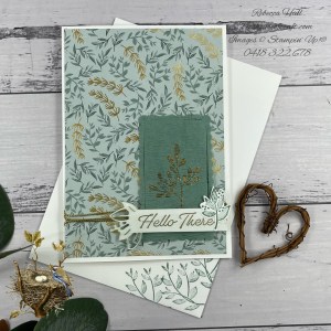 Join me in this months online class to build your stash of cards, that are ready to send out when the occasion calls for it. This collection is full of floral foliage in green shades with gold tones throughout check out the collection below.