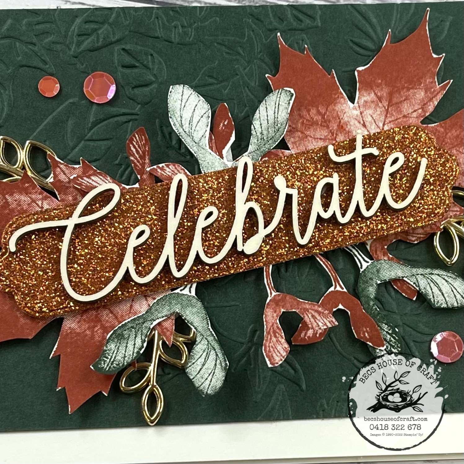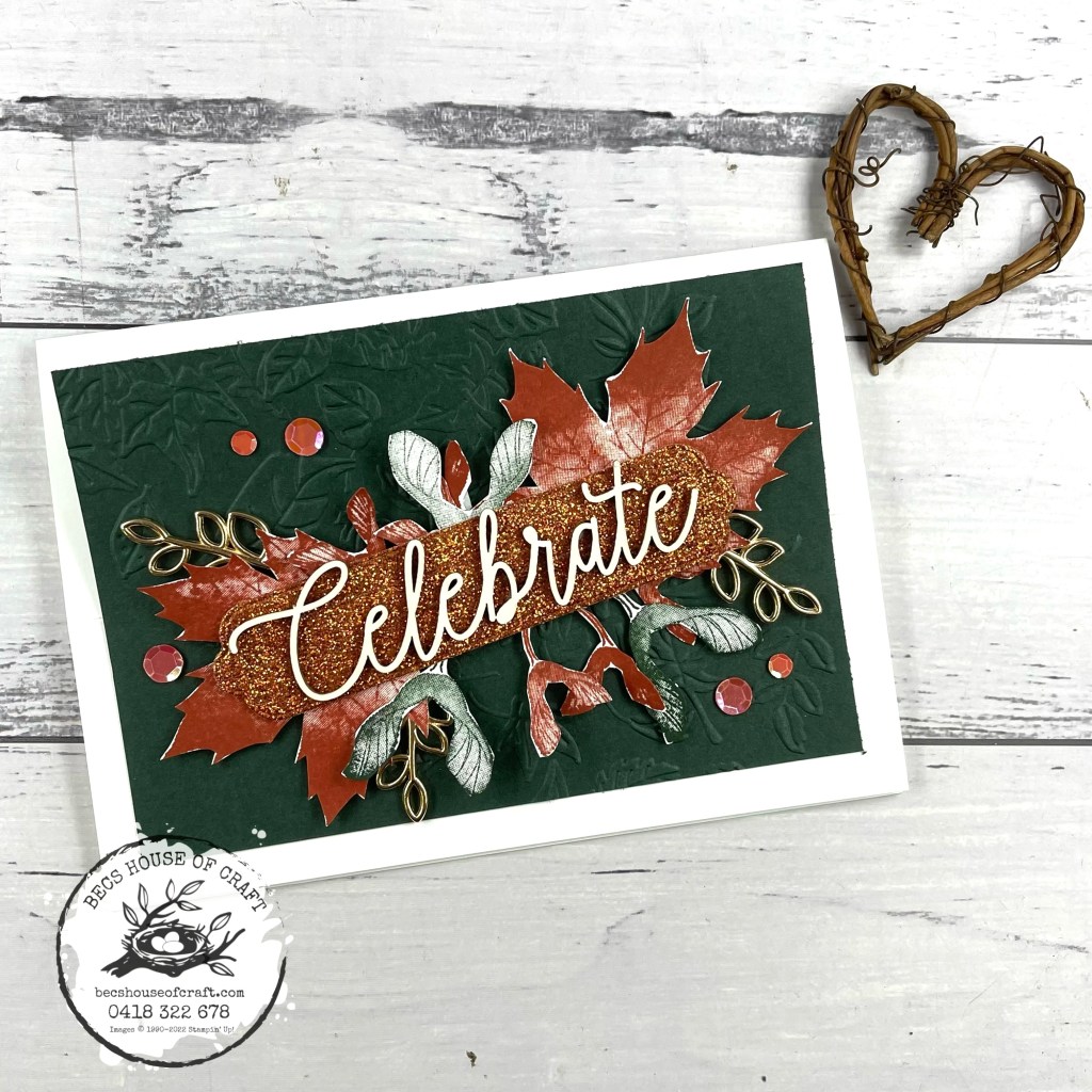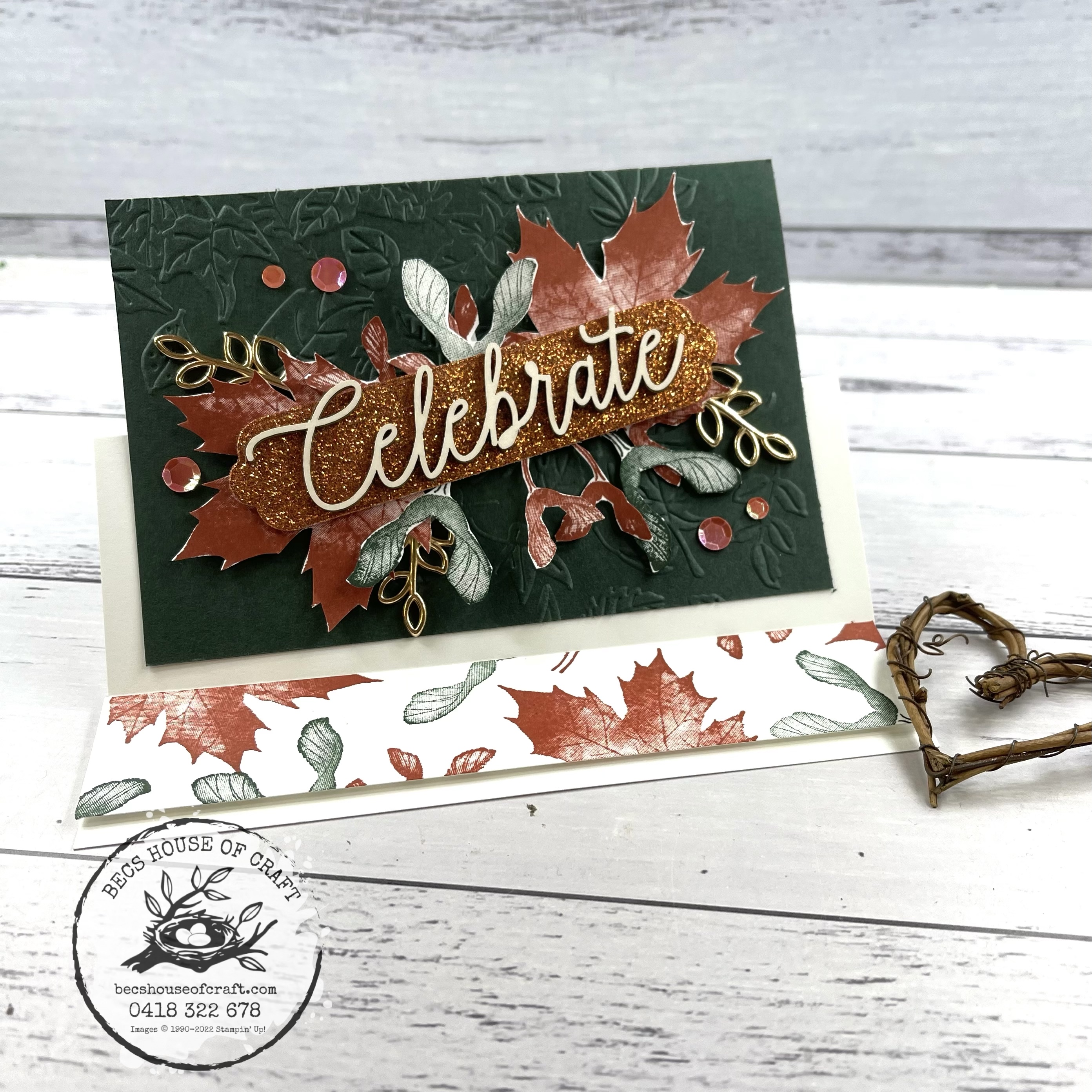I then stamped the beautiful maple leaf from the Soft Seedling stamp set in Cajun Craze ink and the seed pod in Evening Evergreen ink. I then fussy cut these out and secured then to the card front using Stampin’ Dimensionals.